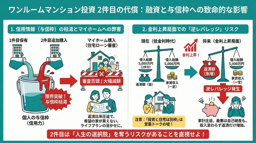 不動産投資ローンの怖さは、単に毎月の収支だけの問題ではありません。2件目を購入することで、あなたの「個人の信用情報(与信枠)」が限界まで使い果たされ、人生の重要なイベントで資金調達ができなくなるリスクがあります。