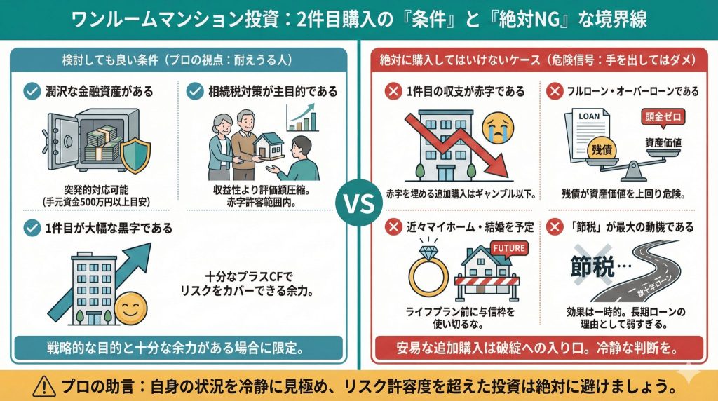 ここまでリスクばかりを強調しましたが、すべての人が2件目の購入をしてはいけないわけではありません。プロの視点から見て、「2件目を購入しても耐えうる人」と「絶対に手を出してはいけない人」の線引きを明確にします。